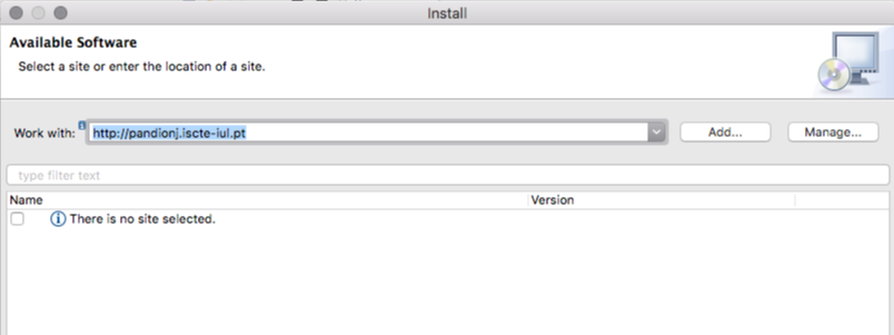 Insert http://pandionj.iscte-iul.pt into the 'Work with' textbox, tick all the options, and proceed with the installation. Upon completion, Eclipse will need to restart. Now you are ready to get started.